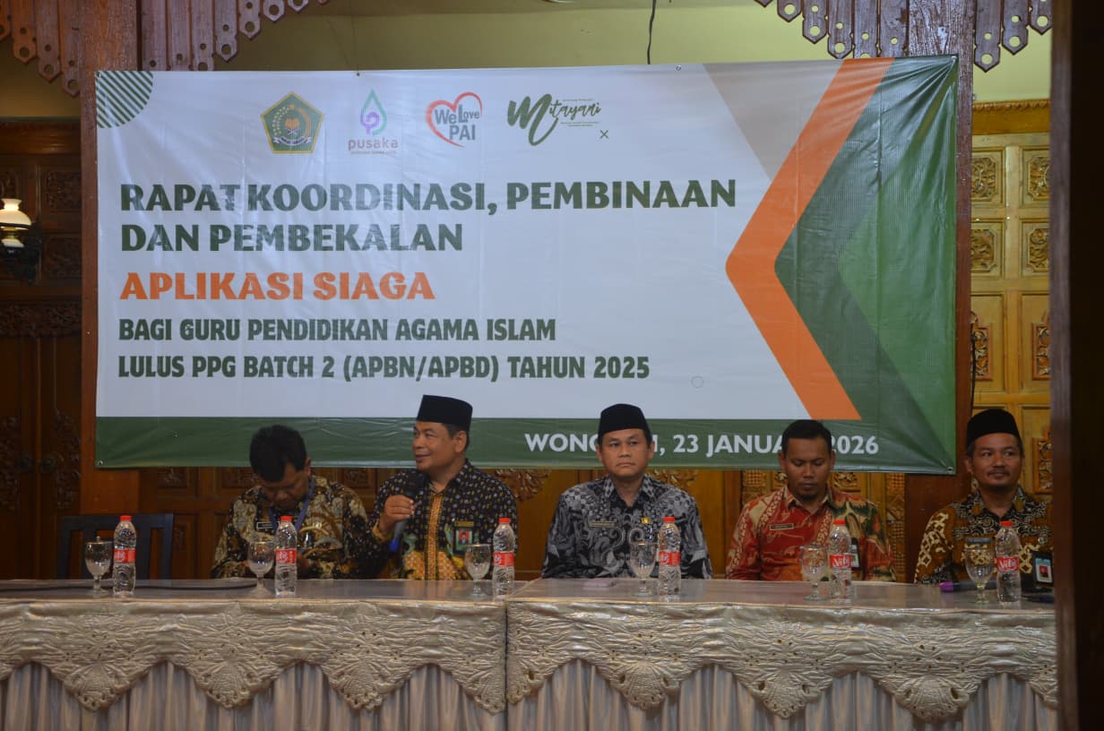 Wonogiri (Humas) — Kantor Kementerian Agama Kabupaten Wonogiri bersama paguyuban lulus PPG batch 2 menyelenggarakan Rapat Koordinasi, Pembinaan, dan Pembekalan Aplikasi SIAGA bagi Guru Pendidikan Agama Islam (PAI) yang lulus Program Pendidikan Profesi Guru (PPG) Batch 2 di Pendopo RM. Saraswati pada Jumat (23/1/2025). Kegiatan ini diikuti oleh 239 guru PAI dan bertujuan untuk penguatan profesionalisme serta peningkatan layanan administrasi keagamaan berbasis digital.