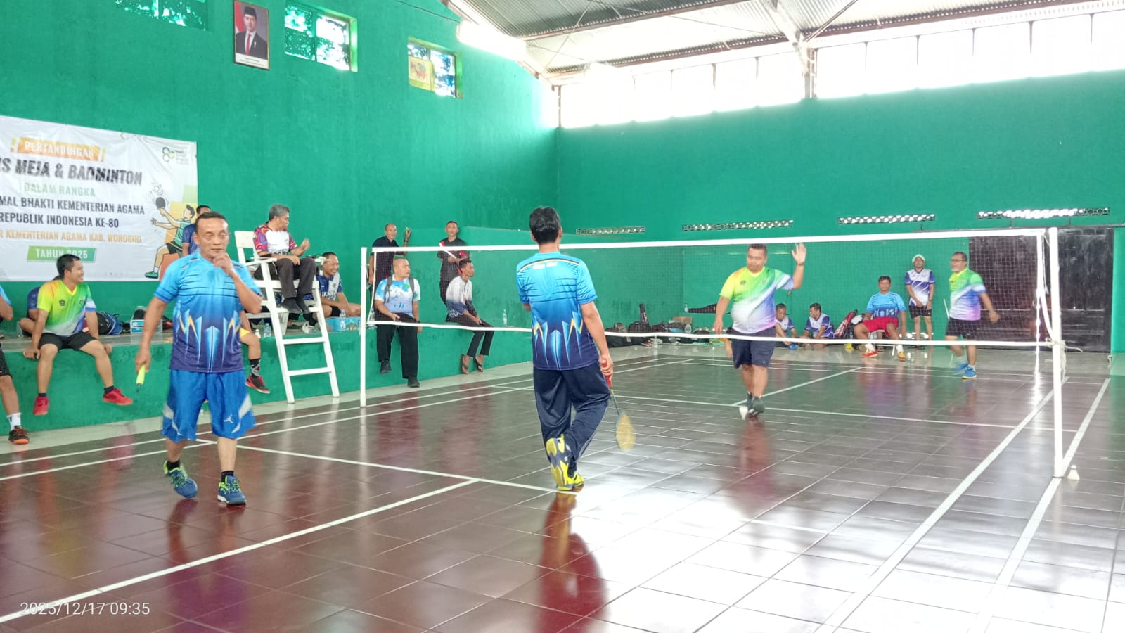 Wonogiri (Humas) – Kantor Kementerian Agama (Kemenag) Kabupaten Wonogiri sukses menggelar turnamen badminton internal yang berlangsung pada Rabu, (17/12/2025) di Gedung Badminton Balaidesa Pule, Selogiri. Kegiatan ini diikuti oleh lebih dari 100 peserta dari berbagai satuan kerja di lingkungan Kemenag Wonogiri, dengan tujuan mempererat kebersamaan dan semangat olahraga di antara pegawai.